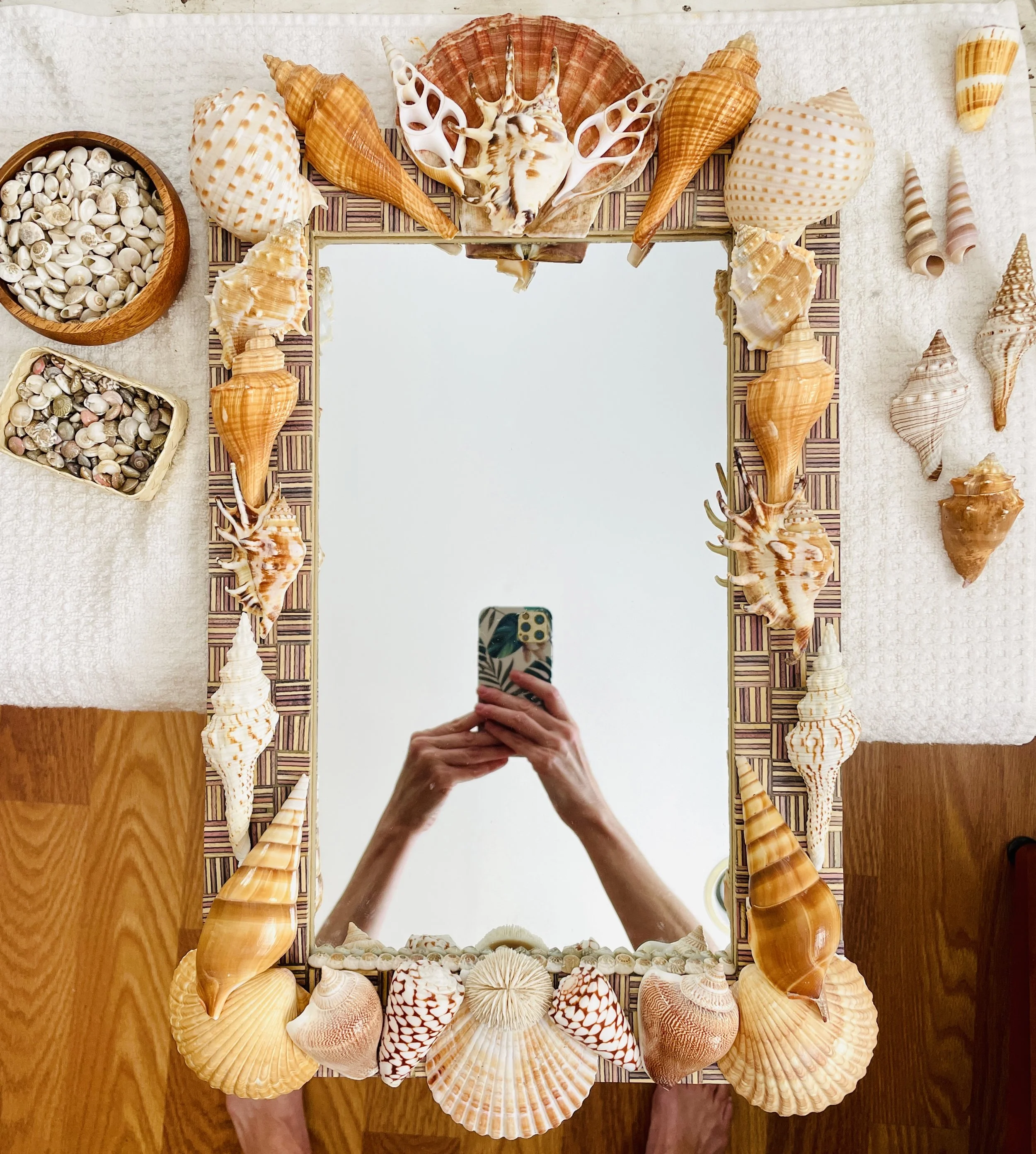 Jo would be thrilled to create a custom shell piece for you by commission. All work can be produced to your desired size, shape, and coloring. Jo creates custom mirrors, boxes, photo frames or office decor, for example. Jo can also work directly on your wall, or fill an entire space. Jo will work with you to bring your vision life!